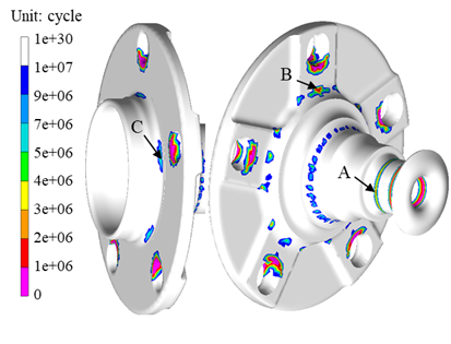 - 일반적으로 피로해석은 피로물성(SN Curve), 해석기법, 시험 데이터로 인하여 해석 신뢰도가 상대적으로 매우 낮은 해석 중 하나임. 특히, 회전부품에 대한 피로해석은 학계에 보고된 이력이 거의 없을 정도로 희소성과 난이도가 높은 해석임