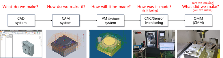 - CAD(모델)~CAM(공정계획, 가공조건, 공구경로)~VM(가상가공; 절삭가공 시뮬레이션)~ Process(CNC상태, 센서신호)~GD&T(품질) 데이터의 상호 참조가 가능한 디지털 쓰레드