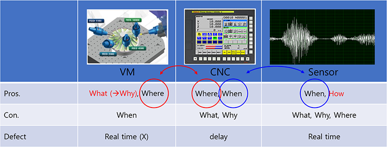- 절삭가공 시뮬레이션 결과, CNC 상태정보, 센서 신호의 동기화를 통한 가상가공기술기반 절삭가공 모니터링기술